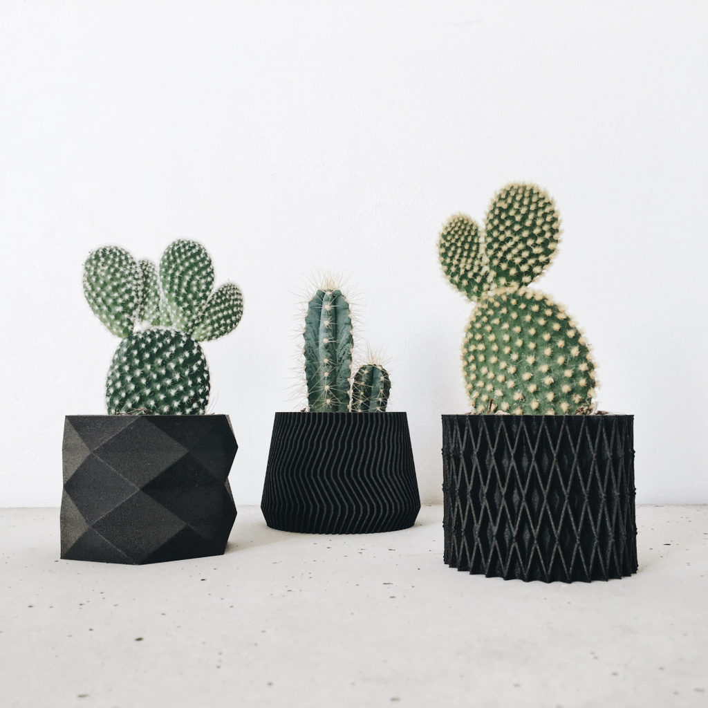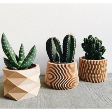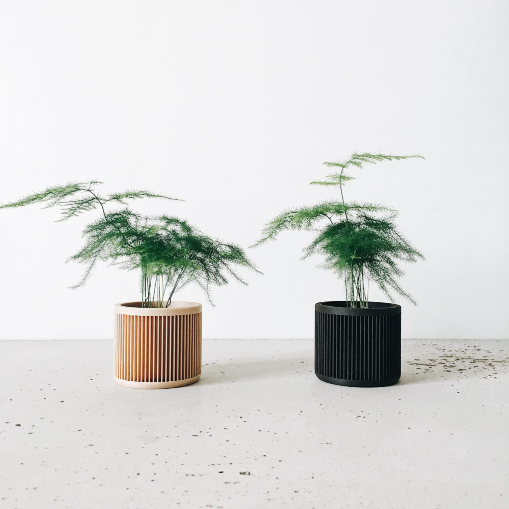 Cache pots imprimés en 3D à partir d’un mélange de sciure de bois et de bioplastique. Coloris naturel ou noir.
